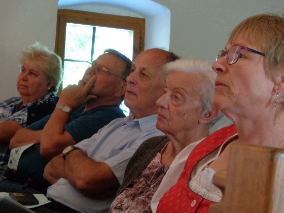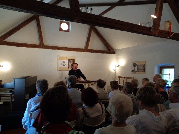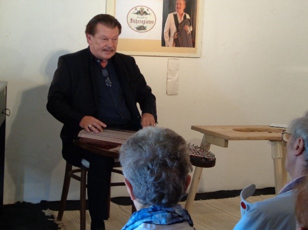 Prof. Scharf zog nicht nur mit seinem Zitherspiel seine Zuhörerschaft in Bann. Er erzählte Wissenswertes über die Welt der Zither, einem Publikum, das -wie sich dann in Gesprächen herausstellen sollte -,sich selber mit diesem Instrument beschäftigt, als Musizierende und Liebhaber von Zithermusik.